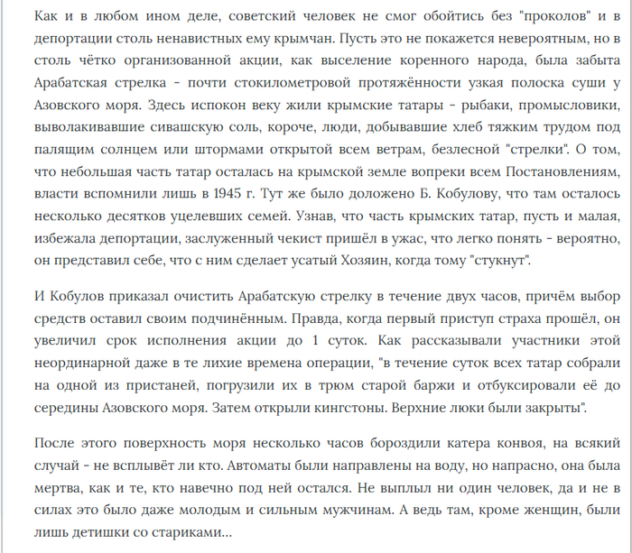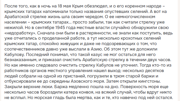 Что же касается утопленных якобы крымских татар, то распространители этой байки, часто путаются в показаниях, для примера на скриншоте ниже видно, как человек пишет, что Крым вообще обезлюдел, а потом внезапно, местные власти обнаружили что на Арабатской стрелке, есть аж несколько селений, откуда крымских татар не выселили после чего приняли решение, погрузить их в баржи и утопить в Азовском море. Если раньше говорилось об одном селении, жителей которых утопили, то теперь появилось аж несколько селений, правда откуда взялись эти несколько селений, и как они назывались, не знают даже распространители этой байки.