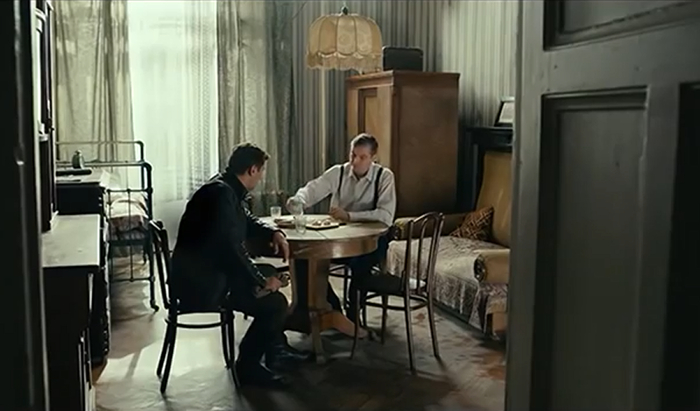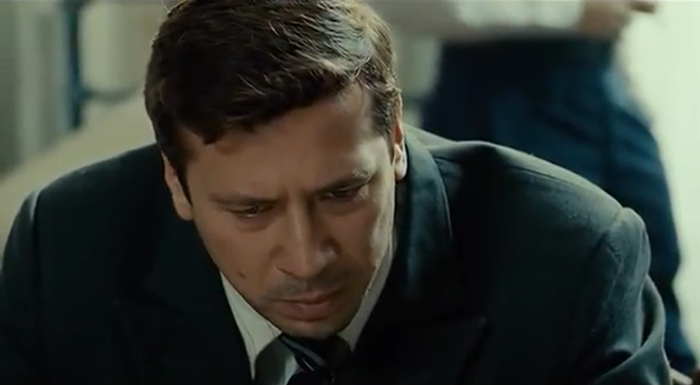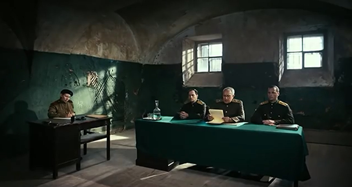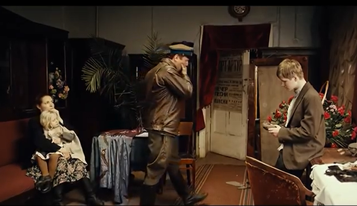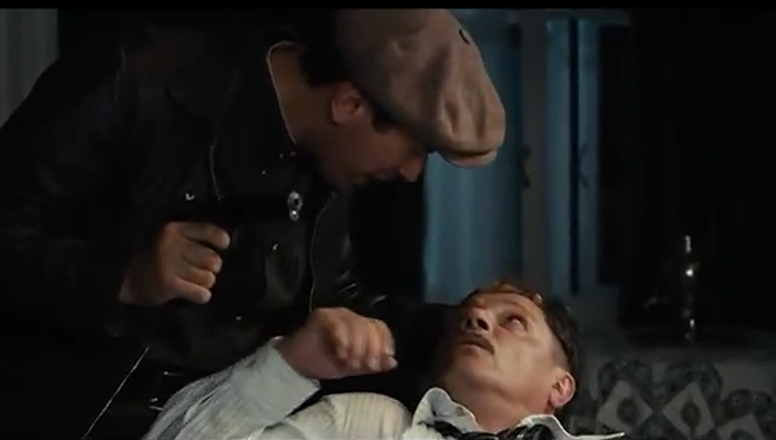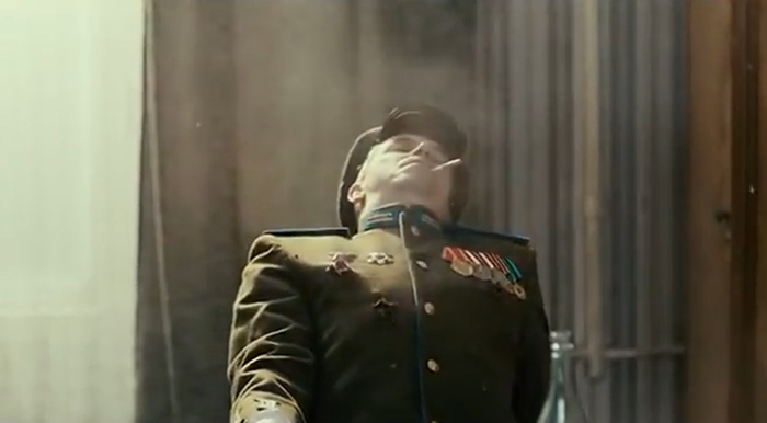 Пока четверо злобных упыря в фуражках с красным околышем ломятся в дверь, Пермяков надевает на себя парадную форму, наливает себе водки, выпивает, после чего садится за стол.