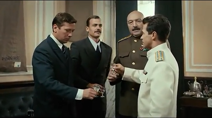 Нас же ожидает двадцать седьмая пьянка за сериал. Паоло в компании Веригина и его приятеля, сидят за столом и водочку кушают, за помин души Джульетты, которая на самом деле жива. Мне вот интересно, как мертвую уголовницу смогли выдать за Джульетту? Что у органов НКВД, в личном деле Джульетты, не было её фотографий, отпечатков пальцев и всего такого прочего?