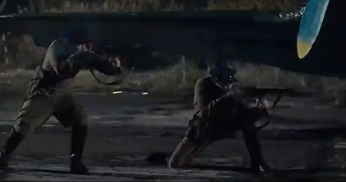 Охрана аэродрома поднимет тревогу, стреляет по Степану чуть ли не в упор, но попасть в него не могут, ибо сценарий не позволяет. Степан же, спокойно, под градом пуль, садится в самолет и заводит двигатель.