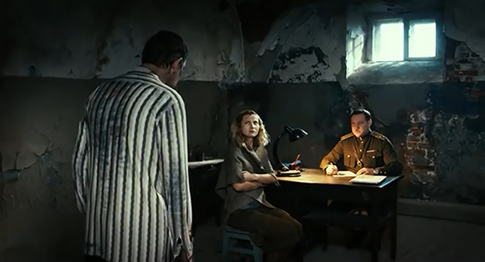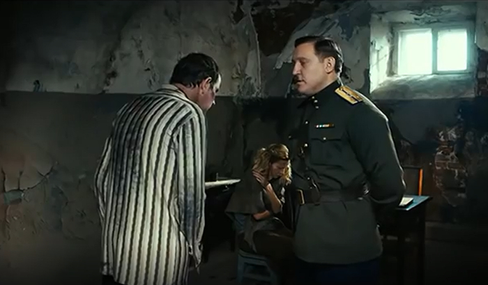Джульетта говорит, что она ничего не знает, капитан Сухонин, предлагает ей присесть, после чего пинком отшвыривает табурет, хватает итальянку за волосы и начинает на неё орать.