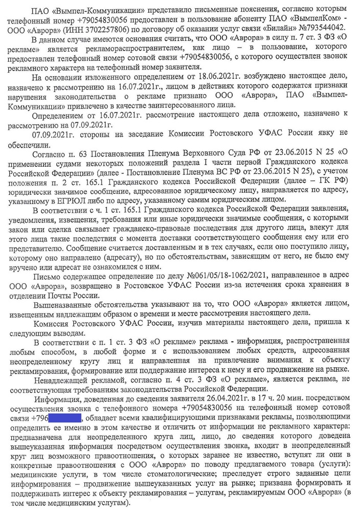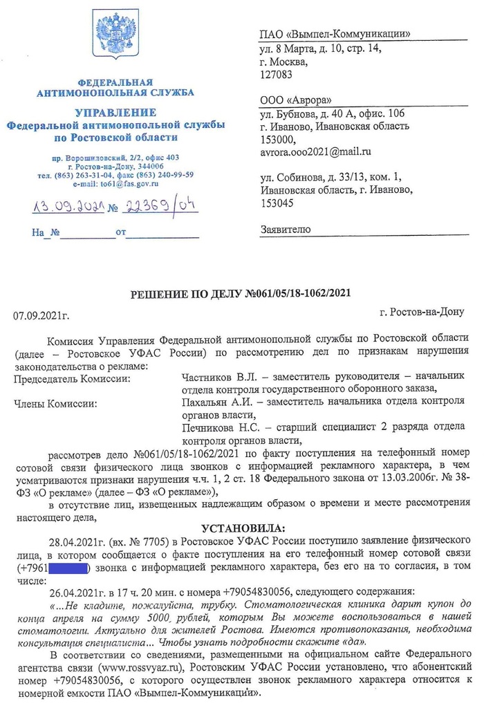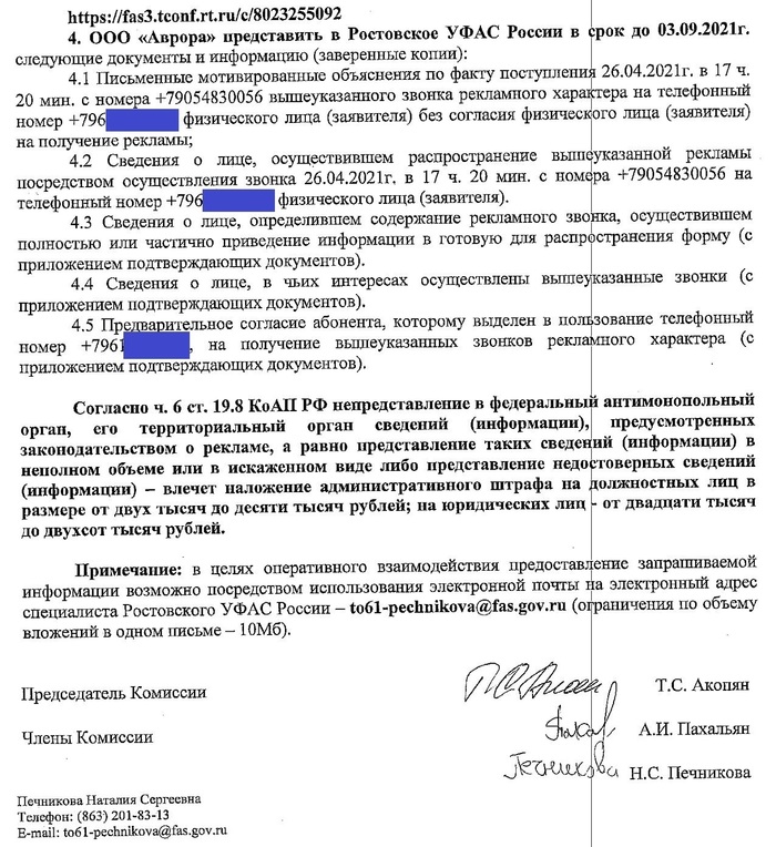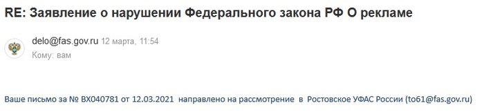 Получаем промежуточный ответ от УФАС России о том, что наша жалоба уехала в местный УФАС, обычно где-то в этот момент количество рекламных звонков резко падает почти до нуля. Видимо спамеры понимают - вы конченый шизик шарите в законах и заносят вас в черные списки (время шизиков в черных списках важны), что собственно нам и надо.