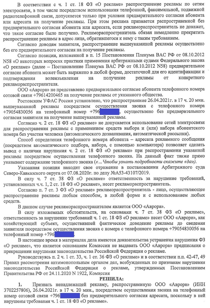 В соответствии с пунктом 1 статьи 18 Федерального закона от 13.03.2006 N 38-ФЗ (ред. от 23.07.2013) О рекламе (далее - ФЗ О рекламе) распространение рекламы допускается только при условии предварительного согласия абонента или адресата на получение рекламы. Своего согласия на получения данной рекламы мною дано не было. Считаю распространение этой рекламы нарушением ФЗ О рекламе.