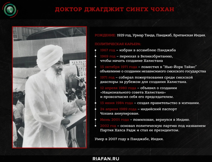 В мае 1980 года Джагджит Сингх Чохан отправился в Лондон и объявил о создании Халистана. Аналогичное заявление сделал другой видный лидер движения, Балбир Сингх Сандху, в индийском городе Амритсар, штата Панджаб, где он выпустил марки и валюту Халистана. Д.С.Чохан объявил себя президентом "Республики Халистан", назначил кабинет министров и выпустил символические халистанские «паспорта», «почтовые марки» и «халистанские доллары». Чоханом были открыты посольства Халистана в Великобритании и других европейских странах. В «Нью-Йорк Таймс» он разместил рекламу будущего сикхского государства.