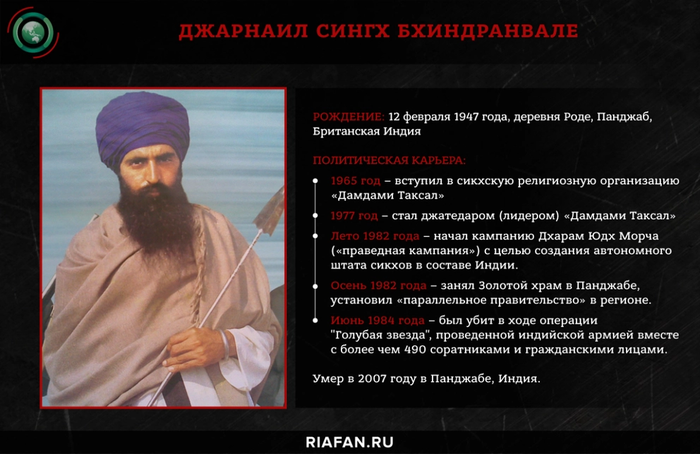 Однако настоящей звездой и самым известным лидером движения стал Джарнаил Сингх Бхиндранвале. Он начал бороться за независимое сикхское государство террористическими методами. Именно для нейтрализации Бхиндранвале индийские войска были вынуждены брать штурмом одну из сикхских святынь десятилетие спустя. В статье, опубликованной в 2004 году в журнале Outlook India, историк сикхского движения Хушвант Сингх описал, как Бхиндранвале прибегал к провокационным высказываниям против индуистского населения.