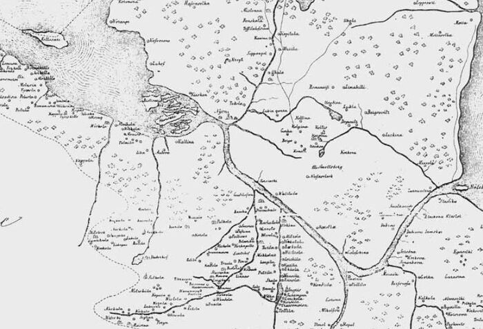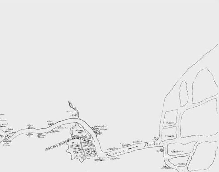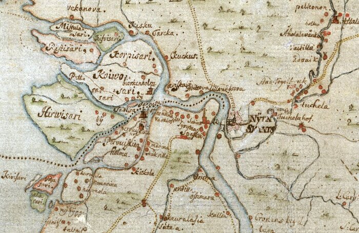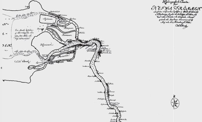 Геометрическая карта реки Невы от Ладожского озера и Нотэборга до Ниеншанца, фрагмент, инженер-фортификатор Э. И. Дальберг, 1681 год (север внизу)