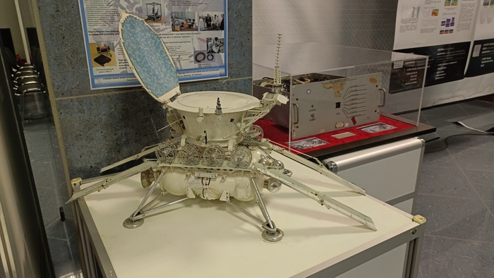 Константин Эрнст и Дмитрий Рогозин стоят рядом со спускаемым аппаратом корабля «Союз МС-18». Именно эта сторона безопасна — противоположная же фонит радиацией. Фото: Татьяна Рогозина