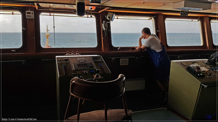 Вчера мы осмотрели мостик. Мы уже знаем, почему он так слабо качается даже при нескольких баллах по шкале Бофорта. У корабля есть система противодействия качанию на волнах, с помощью которой вода вливается в балластные камеры, мгновенно уравновешивая наклон. Мы изучаем информационные системы, радары, прокладываем маршрут до Кейптауна... мы также сидим за деревянным рулевым колесом, в основном, чтобы сфотографироваться.