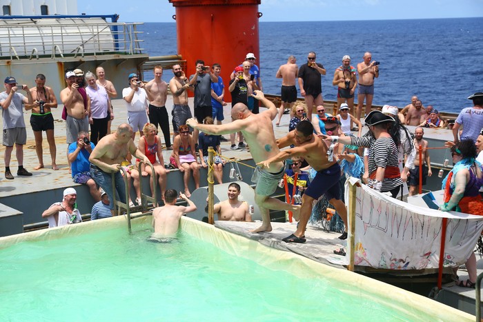 У меня сложилось впечатление, что организация пересечения экватора в сочетании с морским обычаем жестокого обращения с новичками имеет статус подготовки к карнавалу в Рио. В мероприятии участвуют высшие органы экспедиции. В коридорных кулуарах договариваются — с использованием различных средств давления — кандидаты в русалки, Прозерпины или другие персонажи из ближнего круга Нептуна. Женщины шьют наряды, господа шьют пышные брюки.