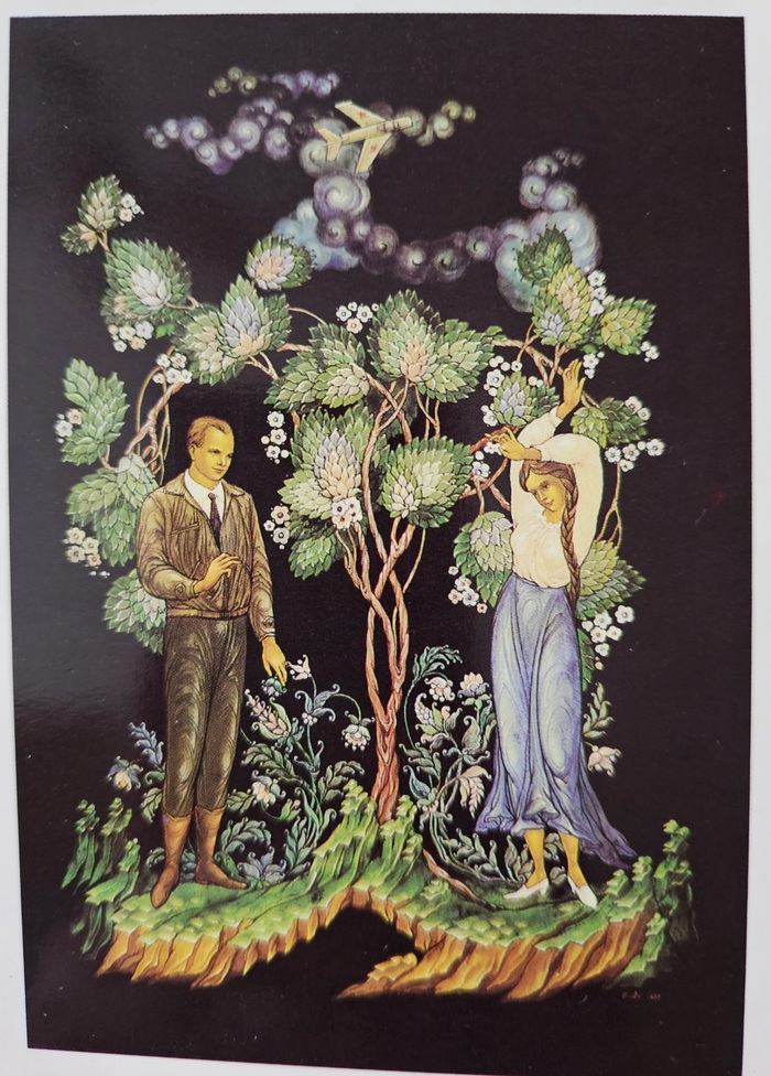 И если в начале XX века многие при изучении трудов великого К. Э. Циолковского относились к его предначертаниям как к фантастике Ж. Верна, то вторая половина столетия превратила фантастику в реальность. И эта реальность прочно вошла в совре- менную литературу, музыку, живопись. Лучшим доказательством справедливости нашего утверждения служит комплект открыток, посвященный Ю. А. Гагарину, выполненный с большой любовью палехскими художниками.