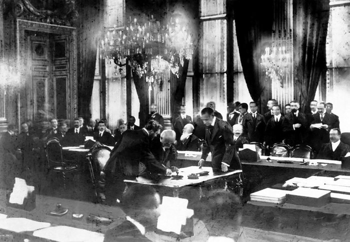 28 июня 1919 года в Версале был заключен мирный договор между странами Антанты, рядом других государств и Германией. Согласно унизительного для Германии договора от нее отторгались территории, а сама Германия объявлялась виновницей в развязывании войны.