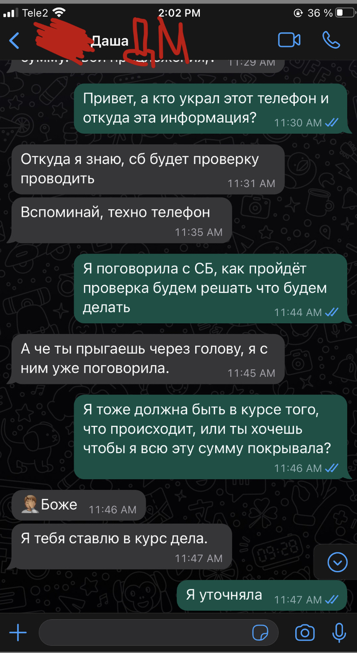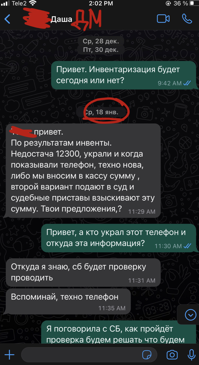 В январе месяце мне пишет эта дама о том, что в кассе минус, пропал телефон (прикреплю сейчас скрины)