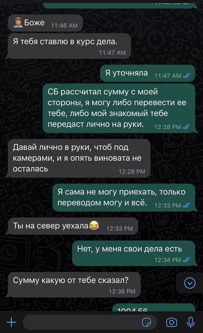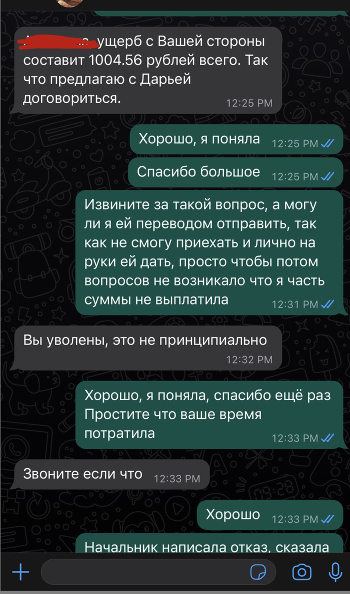 За те, 4 дня которые я работала СБ проверил по камерам и от суммы которую написала начальница я должна заплатить 1004,56