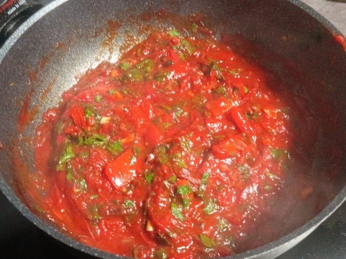 Лук и чеснок мелко нарежьте, у чили выньте семена и также мелко нарежьте. У помидоров выньте мякоть и крупно нарежьте. Разогрейте сковороду с оливковым маслом и обжарьте лук и чеснок. Затем добавьте 3/4 помидоров, томатную пасту, мед, соль и черный перец, жарьте 20 минут.