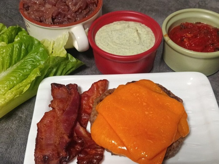На нижнюю булочку выложите соус, верхнюю немного смажьте. На нижнюю нарезанный салат, котлету, карамелизированный лук, бекон и томатную сальсу. Накройте верхней булочкой.