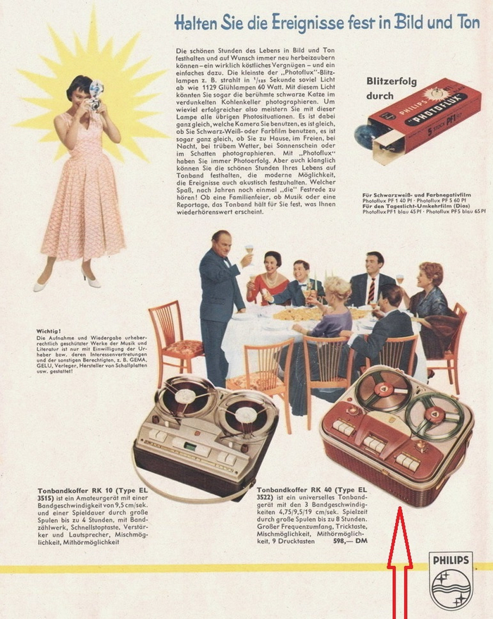 Замечательная реклама, только номер модели не указали. Пришлось покопаться в старых каталогах фирмы Филипс-результат не заставил себя ждать: этот магнитофон «засветился» в каталоге за 1958 год.