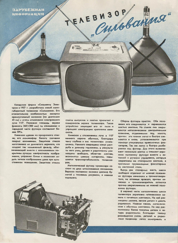 Очень обстоятельная статья о начале применения новых кинескопов с отклонением луча 110 градусов канадской фирмой "Сильвания электрик". Это новшество позволило существенно укоротить "хвост" кинескопа, а значит и толщину самого телевизора.