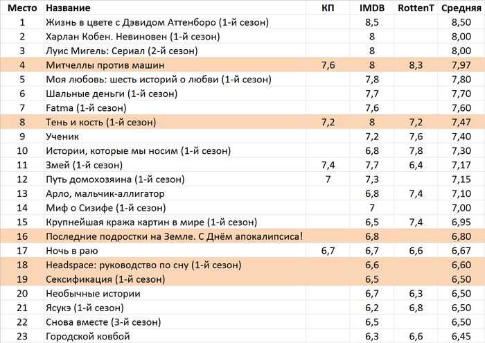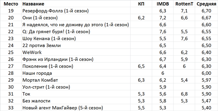 Таблица с рейтингами Кинопоиска, IMDB и Rottentomatoes.