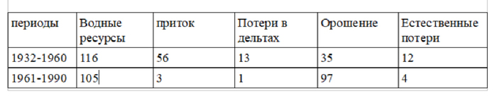 За 2023 г. из бассейна р.Амударья при установленном лимите водозабора в объёме 55,17 км3 фактически было забрано 47,58 км3, то есть больше половины стока. Вот и все. Испарение и осадки не меняются, а речной сток уменьшен минимум вполовину. Можно больше ничего и не писать. Конечно, можно возразить, что это данные только за 2023 год, но нет. Такая ситуация имеет место с 60-х годов до наших дней. В таблице ниже средние данные по приходным и расходным составляющим водного баланса Аральского моря (км3/год).