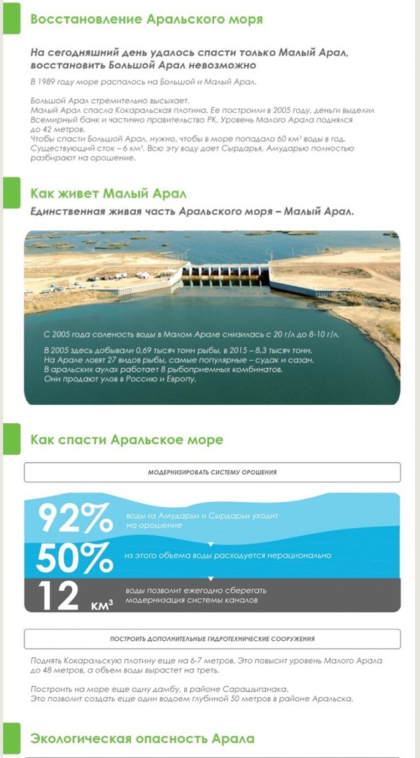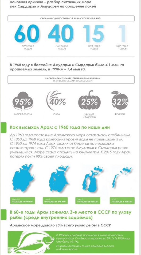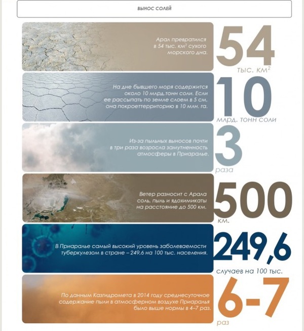 Летом 2014 года согласно сделанным в августе спутниковым снимкам, опубликованным на сайте Earth Observatory Национального управления по воздухоплаванию и исследованию космического пространства США (NASA), впервые в истории восточная половина Аральского моря, которая до 2000 года была самой крупной его частью, – полностью высохла. http://pikabu.ru/story/byivshee_aralskoe_more_4883168