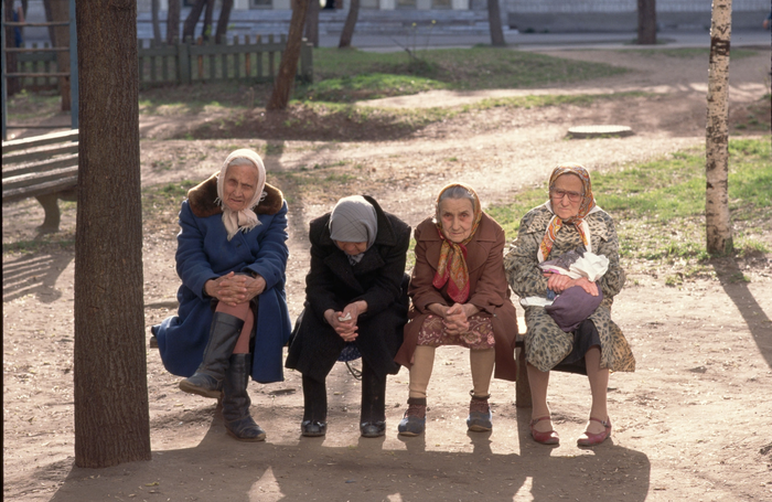 Пожилые женщины сидят на скамейке в парке в Кирове. 13 мая 1996 год.