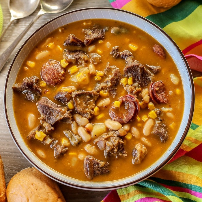 Локро — это национальный аргентинский густой суп из свинины, говядины, фасоли, тыквы и кукурузы, который традиционно готовят два раза в году — 25 мая, в День революции и 9 июля, в День независимости. Это такой вариант нажористой еды, которую готовили аргентинские солдаты во время войны за независимость. Ниже приведу рецепт блюда примерно на 10 порций.