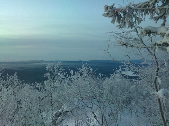 Еще минут 10 мы любовались пейзажами - горы напротив нас застилают облака, над ними встает Солнце, деревья укутаны инеем. Но время бежало, надо было идти обратно, чтобы ехать автостопом на ночной поезд из Екатеринбурга домой.