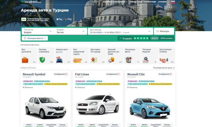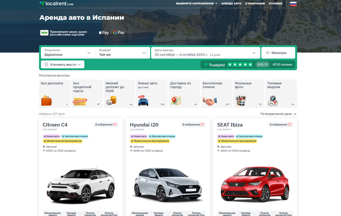 Localrent соединяет вас с локальными прокатчиками. Важная деталь — прозрачная разбивка платежей: небольшая предоплата онлайн, остальное — при получении. Для меня это удобно в двух сценариях: когда даты ещё «дышат» и когда не хочу блокировать крупную сумму на карте заранее. В инструкциях по бронированию схема платежа расписана шаг за шагом, без сюрпризов на стойке.