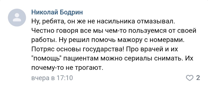 Таким образом, ваше заключение очень точно: «...разрушает веру в коррупционные механизмы». Государство формально наказывает за нарушение закона. Но для многих в обществе это выглядит как «наказание за некомпетентность в коррупции», а не за саму коррупцию. Это и порождает циничные комментарии вроде «врачей почему-то не трогают» — люди видят избирательность правосудия и не верят в его беспристрастность.