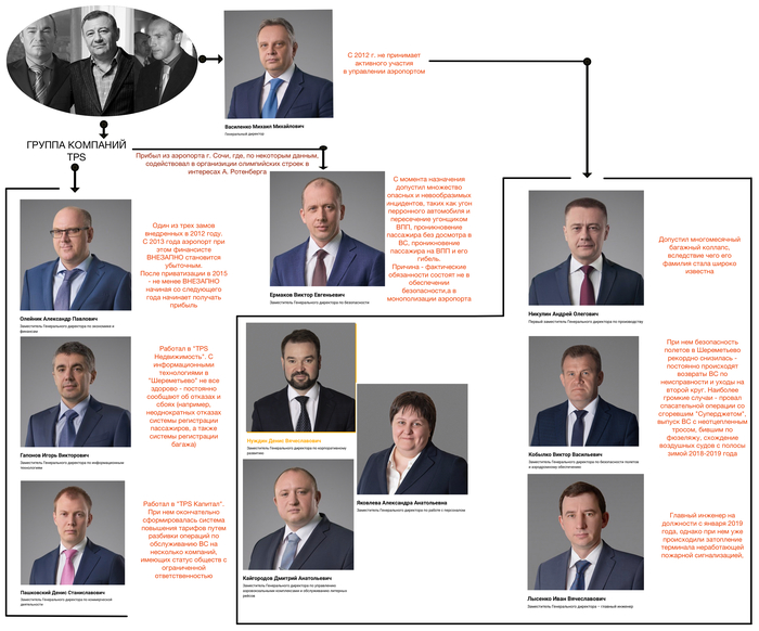 Тут все еще проще - трое прямых ставленников оффшора TPS (один из них, Олейник - один из той самой «тройки», которая пришла помогать «прихватизировать» аэропорт), выходец из Сочи Виктор Ермаков (на самом деле в Шереметьево есть и другие ставленники из Сочи, например - новый начальник таможни Алексей Тимофеев, который давал «добро» грузам для олимпийской стройки в среднем за 9 минут. Ах да, забыл - Ротенберг стал, кажется, самым крупным подрядчиком олимпийской стройки. И да, Ермаков отмечен благодарностью Минтранса за помощь в организации этих самых олимпийских игр - вот и думайте) и остальные. Больше всего населению страны печально известен человек-багаж Андрей Никулин, которого все никак уволить не могут (да да, в реестре он все еще числится генеральным директором «Шереметьево Хэндлинг», и уж в любом случае останется замом генерального директора всего аэропорта), а в профильных органах неплохо знают фигуру Виктора Кобылко, который находится в крайне тяжелом (и опасном) положении из-за постоянных отклонений «Шереметьево» в сфере безопасности полетов, и первым кандидатом на СИЗО в случае, если в Шереметьево что-то опять произойдет с безопасностью полетов.