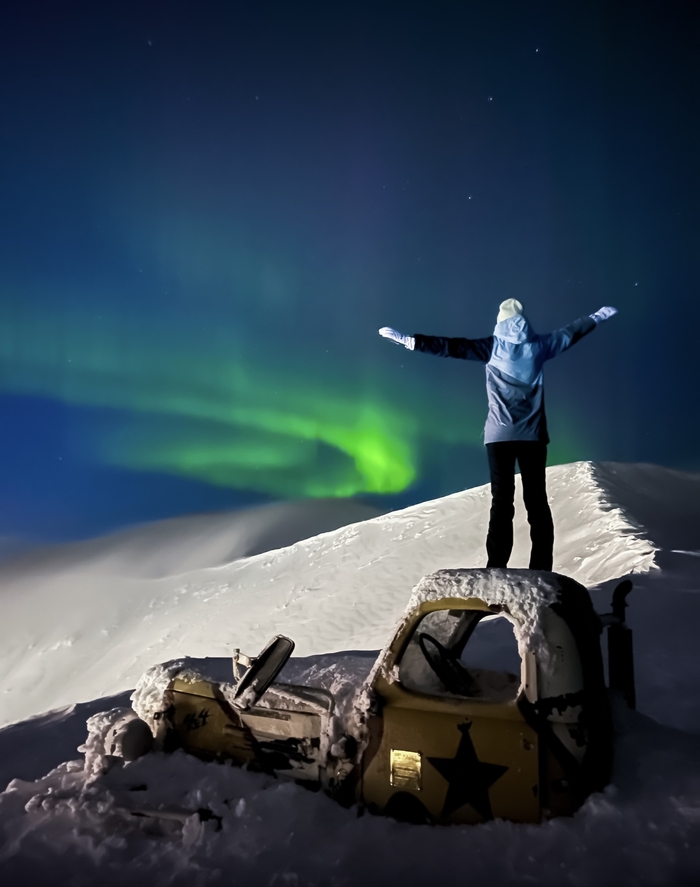 На встречу, в метрах 10 от нас, шла девушка с собачкой , которая что-то там кричала , какое-то время мы не могли разобрать что она хочет. Подойдя ближе оказалось , что позади нас начало появляться северное сияние( проявлялось оно в светлых полосках на небе, как след от самолета) И если бы ни эта девушка с собачкой , мы бы благополучно спустились на канатной дороге ни о чем не подозревая.