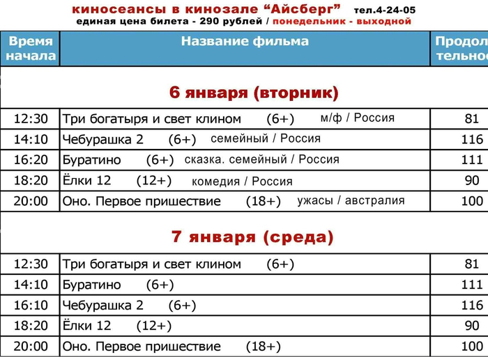 В нем работают всякие кружки для детей и взрослых, кукольный театр, кинотеатр. Вот кстати афиша на 6-7 января: