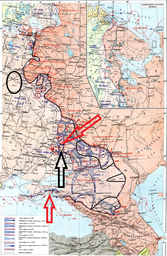 На картах красными стрелками обозначены основные удары советских войск, чёрными немецких и их союзников, голубыми направления основных событий на других театрах военных действий, жёлтыми границы отвоёванных территорий при наступлении той или другой стороны.