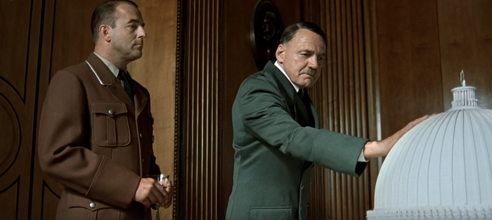 Хайно Ферх (слева) в роли А. Шпеера на фоне собственной разработки макета перестройки Берлина, который должен был получить новое название "Германия столица мира" в исторической драме Оливера Хиршбигеля "Бункер". 2004-й год.