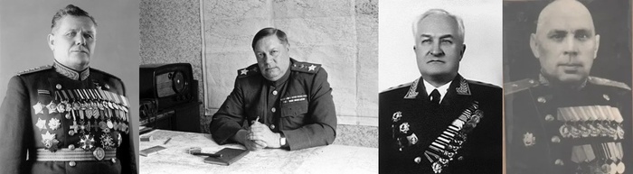 На фото генералы А. И. Ерёменко, Ф. И. Толбухин, Е. П. Журавлёв и И. И. Попов.