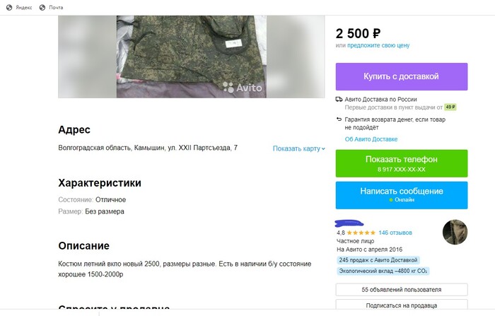 На волне мобилизации и связанных с ней слухов, озадачился я поиском какой-никакой снаряги для возможного прохождения службы. Искал всякое-разное, интересовался ценами на товары от термобелья, заканчивая бронежилетами. Сегодня в подборках предложений, которые могут быть мне интересными на всем известном сайте-барахолке, увидел объявление в г. Камышин Волгоградской обл., продаю, мол, военную форму ВКПО. Зашел в объявление, а в описании написано, цитирую: "Костюм летний вкпо новый 2500, размеры разные. Есть в наличии б/у состояние хорошее 1500-2000р". Зашел на страницу продавца, а у него целая куча таких объявлений. Начиная от чехлов для саперных лопат, заканчивая армейскими матрасами. Почти во всех объявлениях пишут, что в наличии несколько штук.