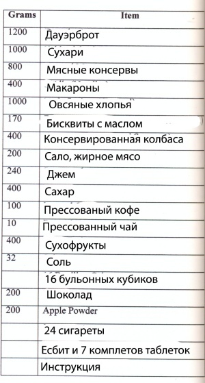 1). Сухие хлебопродукты - дневной запас состоял из 250 граммов сухарей, печенья или кнакеброта.