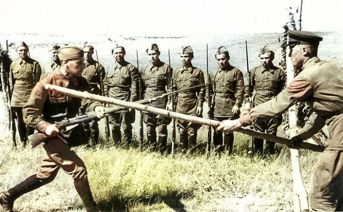 Прекрасно понимая характер будущей войны, советское командование воспитывало высокий боевой дух и решительность в солдатах. А что ещё может так укрепить дух, как поединок лицом к лицу с противником?