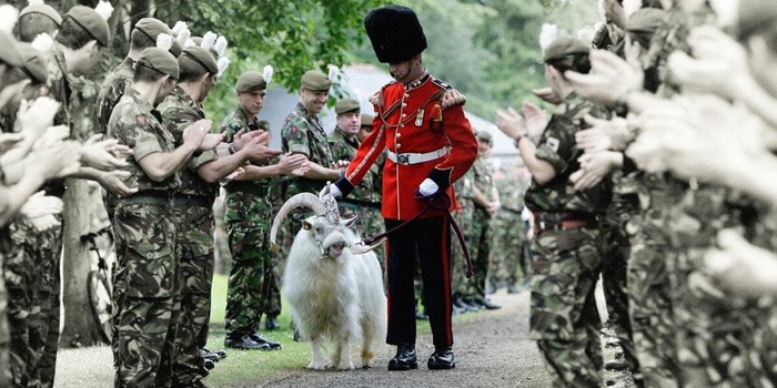 Британцы умеют делать ритуалы с юмором: в ряде полков официально числится козёл-маскот. Он даже получает почётные звания и участвует в парадах. Легенда гласит, что однажды рогатое животное затесалось в строй — и с тех пор стало частью гарнизона. Козёл Уильям (или его однофамильцы) то и дело попадает в новости: то «не удержал строй», то боднул барабанщика — и над ним посмеются, и протокол допишут.