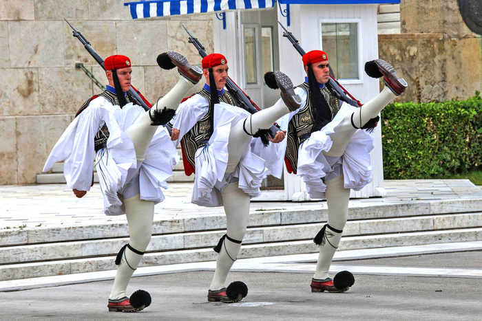 Элита греческой почётной гвардии — эвзоны — в своей фустанелле похожи на героев народных легенд. Видимо, кто-то удивится: «Почему юбки? Почему помпоны?» Да потому что каждая деталь униформы — код истории: отструженные формы, подвязки, туфли с помпонами — память о прошлых боях и народных костюмах. Но главное — их шаг: медленный, высокий, почти танцевальный, который вызывает восторг и недоумение одновременно.