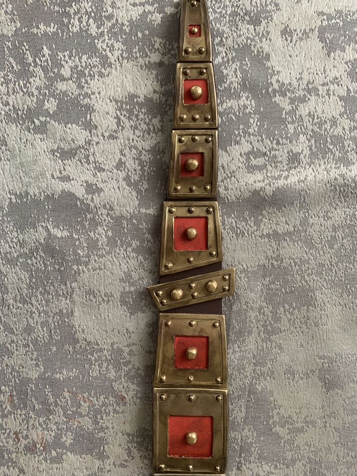 По костюму: чешуйки, как я писала, сделаны вручную, меч из пластика, а вот диадема и ремень стальные.