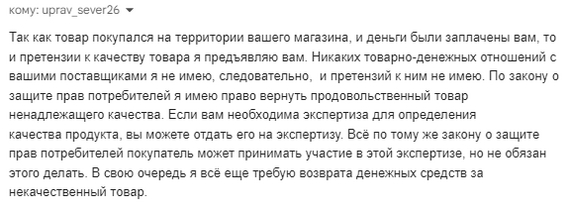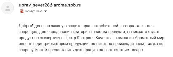 Окрылённые праведным гневом мы побежали возвращать эту бурду обратно - а нам хер без масла, ничем помочь не можем. Но как же так! Товар то не качественный, а значит я могу его вернуть. Письменное обращение в Ароматный мир привело вот к такому диалогу:
