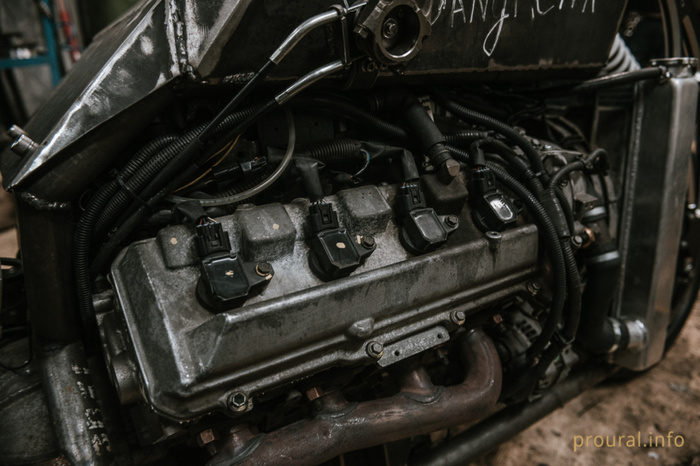 Детище конструктора Артема Болдырева демонстрирует настоящий рев двигателя в 300 лошадиных сил. Основу составляют 8-цилиндровый мотор от «Лексуса» и передний редуктор «Тойоты Марк 2». Руль и фара от мотоцикла «Харлей Дэвидсон». Но многое было сделано вручную: колеса, передняя вилка, топливный бак и рама. Меньше года назад Артем Болдырев задумал создать собственный мотоцикл на манер знаменитых Boss Hoss – двухколесных гигантов.