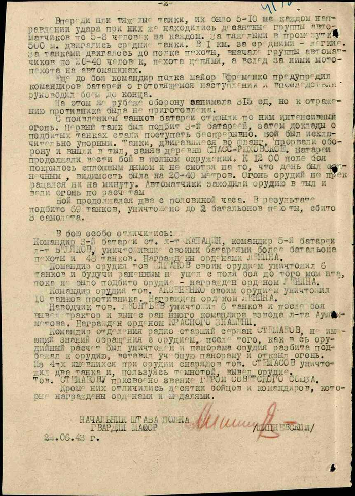 По-видимому, противник намеревался быстро прорвать оборону и устремиться дальше на восток, но как бы не так! Врага встретили огнем советские расчеты, имевшие на вооружении орудия 76 калибра.Как итог, враг отступил, потеряв 7 машин подбитыми. Далее, перегруппировавшись и с большими силами, а наши насчитали до 200 танков, немцы нанесли три удара: справа, слева и по центру с целью разорвать советскую оборону на очаги. И да, фланговым группам удается это сделать и взять Спасск-Рюховское, при этом советские артиллеристы под командованием майора Николая Карповича Ефременко продолжили бой. Как указано в документе, поле боя затянуло густым дымом и пылью, что позволило немецким автоматчикам подбираться к артиллеристам и вступать в ближний бой, который шел 2.5 часа, и согласно нашим документам было заявлено 69 подбитых танков противника.