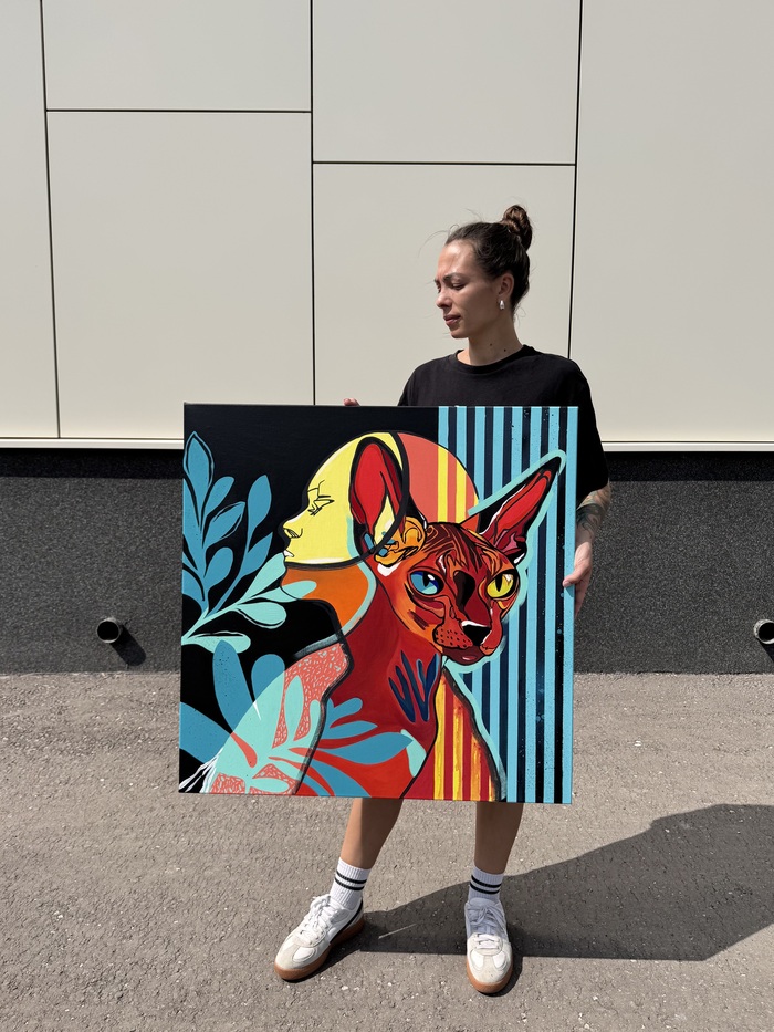На холсте я переплела в одну историю встречу двух загадочных существ: огненно-красного кота-сфинкса