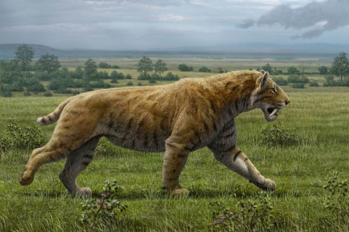Другое название это доисторической кошки – саблезубый тигр. Эти хищники обитали на планете 10000лет назад, самому древнему ископаемому образу насчитывается 20 млн. лет. Отличительной особенностью Смилодонов были очень мощные передние лапы и огромные клыки, которые достигали 25-30см в длину. Размерами он был с обычного льва или тигра, хоты имел более мощное телосложение и вес до 400 кг.Данный хищник не только активно охотился, но и мог питаться падалью. До сих пор идут споры относительно назначения его больших клыков. Одни предполагают, что они были нужны при охоте на жертву для быстрого умерщвления, а другие как атрибут для привлечения самок.