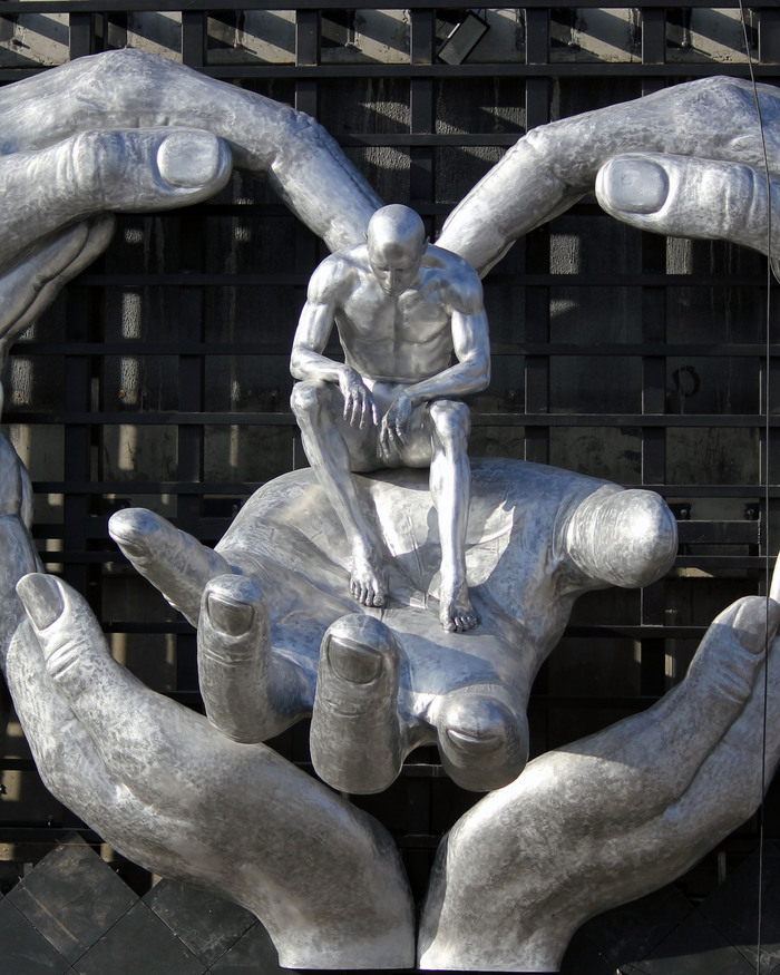Композиция изображает сгорбленного обнажённого человека, сидящего на огромной ладони, которая заботливо его поддерживает.