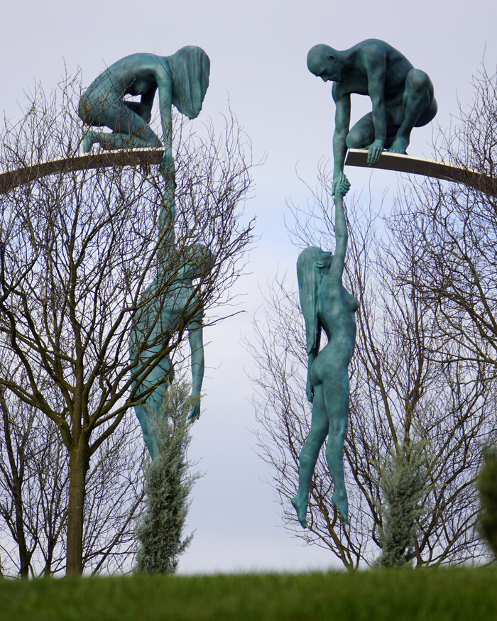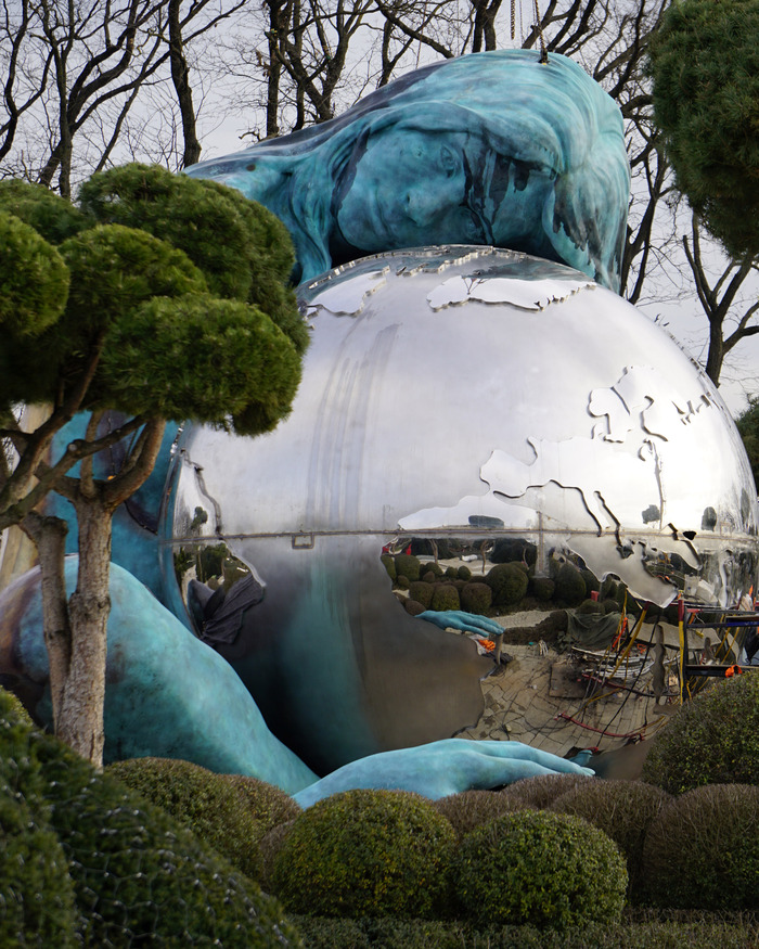 Идёт установка скульптур предположительно автора художника Лоренцо Куинн. Рука бога и мать природа.