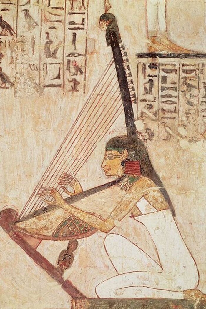 О древнем происхождении дугообразной арфы, свидетельствует это древнеегипетское надгробное панно (Фивы около 1400 года до нашей эры).