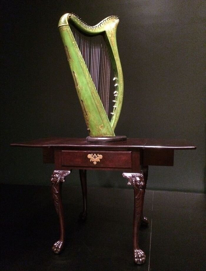 На снимке ниже: великолепная переносная арфа, изготовленная в 1820 году в Дублине Джоном Иганом, сумевшим возродить в своей стране традицию игры на арфе. Инструмент окрашен в национальные цвета Ирландии - светло-зеленый и золотистый.